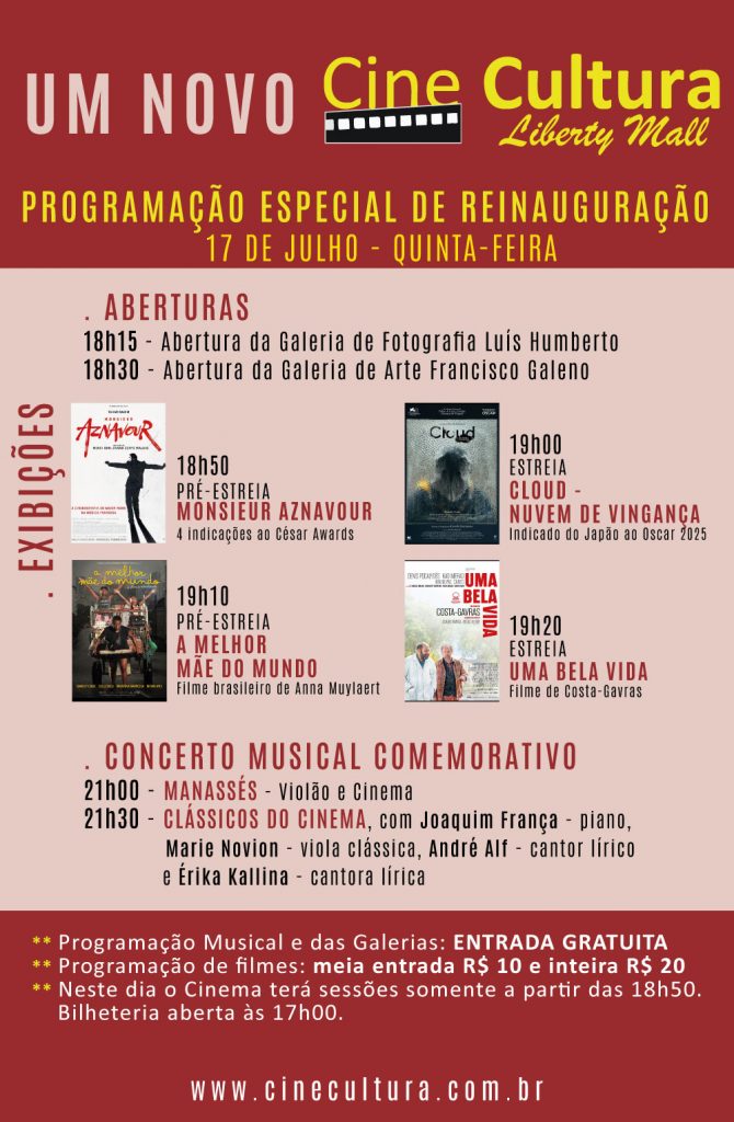 Programação Especial de Reabertura do Cine Cultura Liberty Mall – Dia 17 de julho – quinta-feira . ABERTURAS 18h15 – Abertura da Galeria de Fotografia Luís Humberto 18h30 – Abertura da Galeria de Arte Francisco Galeno . EXIBIÇÕES 18h50 PRÉ-ESTREIA – MONSIEUR AZNAVOUR 4 indicações ao César Awards 19h00 ESTREIA – CLOUD – NUVEM […]